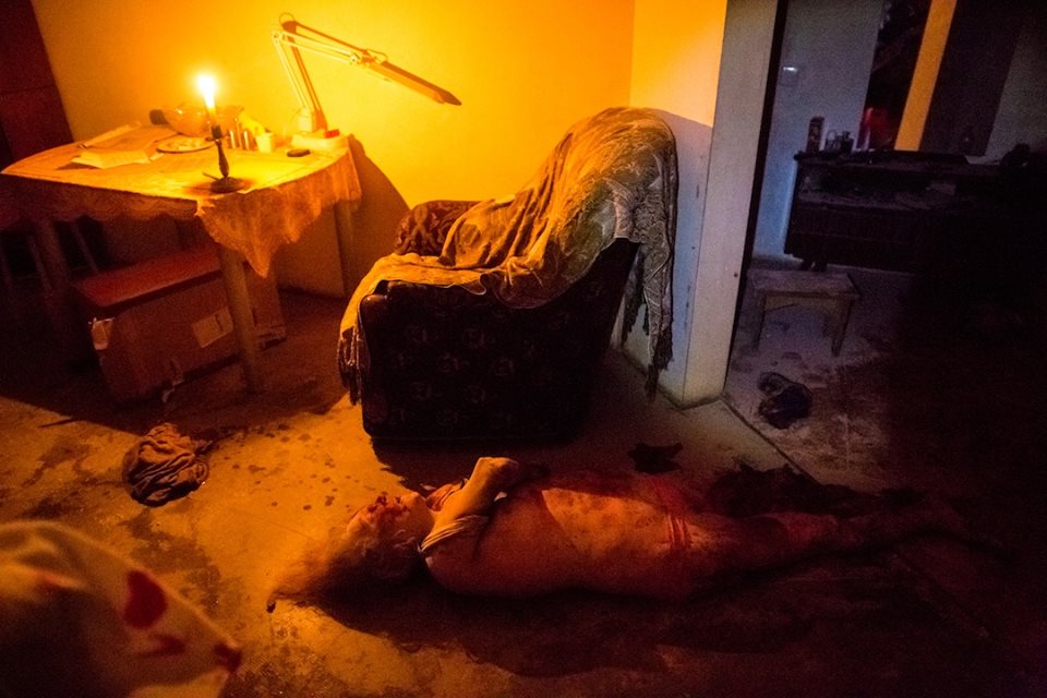 Сижу в съемной квартире. Центр Славянска. Весело, позитивно. Слушаю музон. Настроение хорошее - видимо, бомбить не будут, потому что устали - стреляли утром и днем. Пью джин с колой. Без предупреждения мимо пролетает пара снарядов - БЛЯТЬ ПИЗДЕЦ. Близко вылетают стекла. Поднимается пыль во дворе. Одно дело - сидеть в Семеновке, где такая музыка привычна и ожидаема, другое - расслабленное состояние отдыха. Забегаю за гипсокартонную перегородку. Подгребаю ботинки. Снова - ЕБАТЬ два раза. Закуриваю, лежу. И снова - ЕБЛЫСЬ. Выжидаю десять минут. Тишина. Хватаю фотокамеру. Бегу вниз по лестнице по хрупающим осколкам стекол. Сумерки. Брожу по двору. В подвале тихарятся местные. Бесцеремонно забираю у них свечку и фонарь. Подъезд, второй этаж. Вынесенная дверь квартиры - туда. В клубах пыли ходит серый мужик. Ноги в крови. "Есть пострадавшие?" - спрашиваю. В пятне моего фонаря под мышки вытаскивает из кучи обломков серое тело. "Жену убило". Кладет ее в уцелевшую комнату. Пахнет кровью и газом. В углу сидит окровавленная старуха. "Где Маня, где Маня?" - плачет она. "Маня умерла" - отвечает муж убитой. Развороченое тело Тани перед ней. Я спрашиваю - можно ли снимать. "Снимай, и запиши ее имя и мой телефон" - отвечает муж, бродя по обломкам. Мои руки дрожат. Мужик спокойно садится к телефону и крутит диск, пытается позвонить. Мы втроем уже полчаса. Горит свеча на столе, на полу изуродованный труп. Появляется сосед в очках. Выносим окровавленную бабушку. "Маня, Маня", - зовет она. "Мани больше нет", - твердо отвечает муж. Дальше ополченцы увозят ее в больницу. Прошлись с кем-то по остальным развороченным квартирам. Там никого нет. Ходим, шарим фонариком, нюхаем. Через дорогу соседний дом горит. Ночь. Где-то взрывы. Снова забегаю в подвал, где таятся соседи. Разговоры перед подъездом в минуты затишья, курим. Из развороченной квартире слышим звонит телефон. И снова, и снова… В три часа ночи прихожу домой и засыпаю.